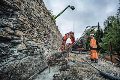 Die Sanierung der 450 m langen Feldsteinmauer am Georgenberg in Goslar barg einige Herausforderungen. Aufgrund des desolaten Zustands der Mauer wurde während der Arbeiten teilweise erst vor Ort über die weitere Vorgehensweise entschieden. Voraussetzung dafür? Jede Menge Flexibilität. Und damit kennen sich unsere Experten von der Spesa bestens aus. So erfolgte im ersten Sanierungsabschnitt die temporär statische Sicherung der Feldsteinmauer sowie die Fertigung des rückverankerten Stahlbeton-Kopfbalkens mithilfe von Mikropfählen. Anschließend konnten sowohl die erforderliche Instandsetzung des Mauerwerks als auch die damit verbundenen Verbauarbeiten beginnen. Trotz aller Herausforderungen und Hürden konnten die gesamten Baumaßnahmen Stein auf Stein Ende 2023 erfolgreich abgeschlossen werden.