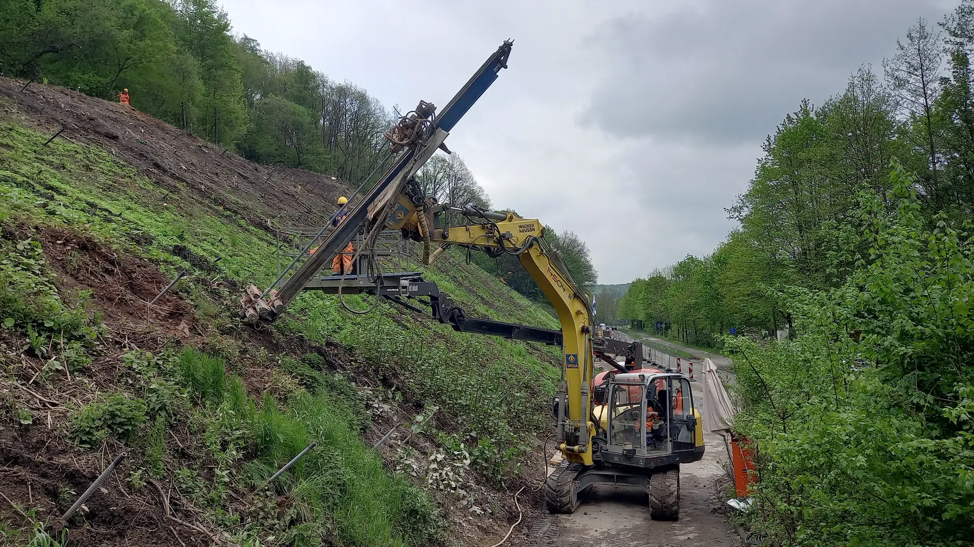 Entlang der Landstraße L527 bei Wuppertal wurden umfangreiche Hangsicherungsmaßnahmen seitens der Spesa Spezialbau und Sanierung notwendig, um das Abrutschen eines Hangs zu verhindern. Nach der Rodung und Räumung des Baufelds wurden rund 1.000 Bohrungen vorgenommen, die zugleich der Kampfmitteluntersuchung dienten. So konnten die rund 10.000 m an verzinkten Bodennägeln gefahrlos in den Untergrund eingebracht werden. Die Komplettleistung von Seiten der Spesa umfasste neben der Kampfmitteluntersuchung und dem Einbringen der Bodennägel zusätzlich den Verbau von 7.000 m² Steinschlagnetzen im unwegsamen Gelände.