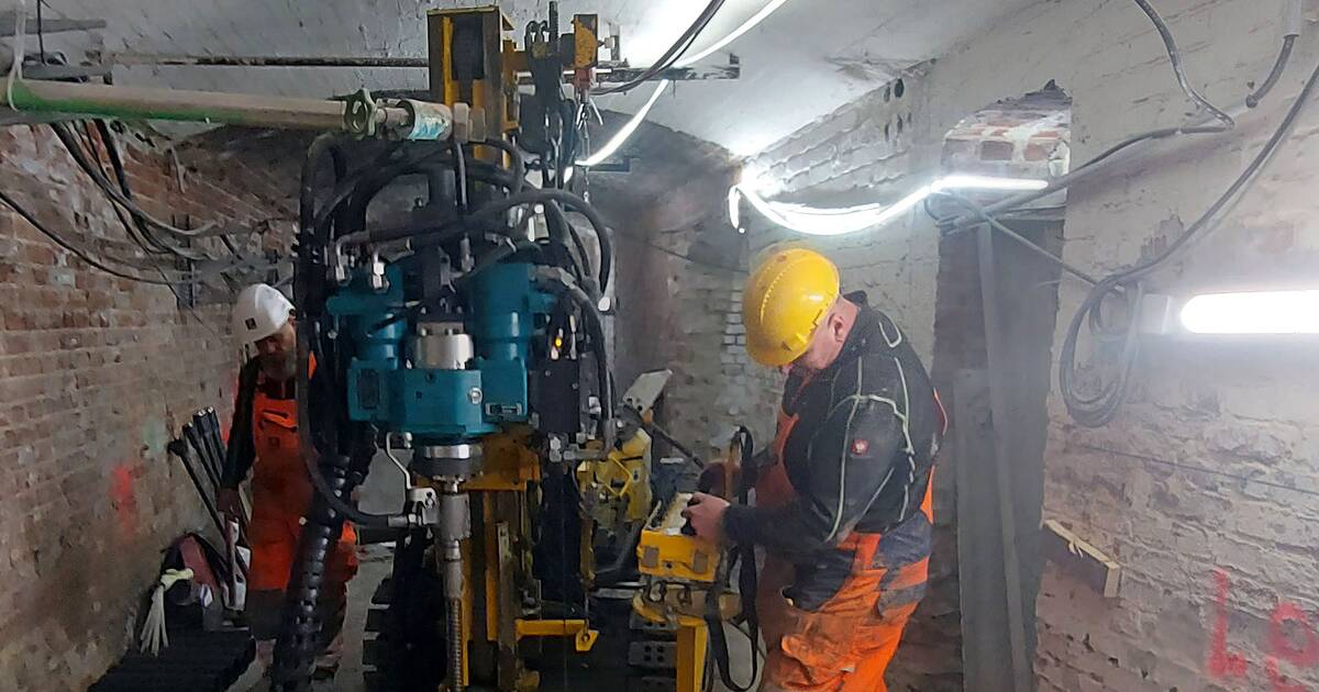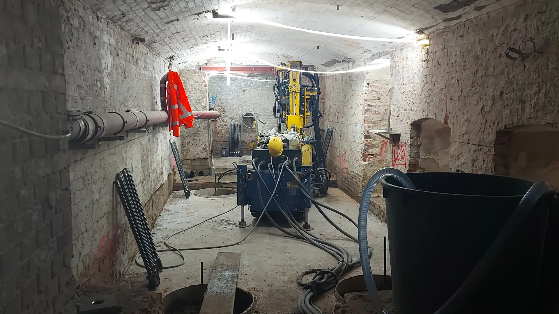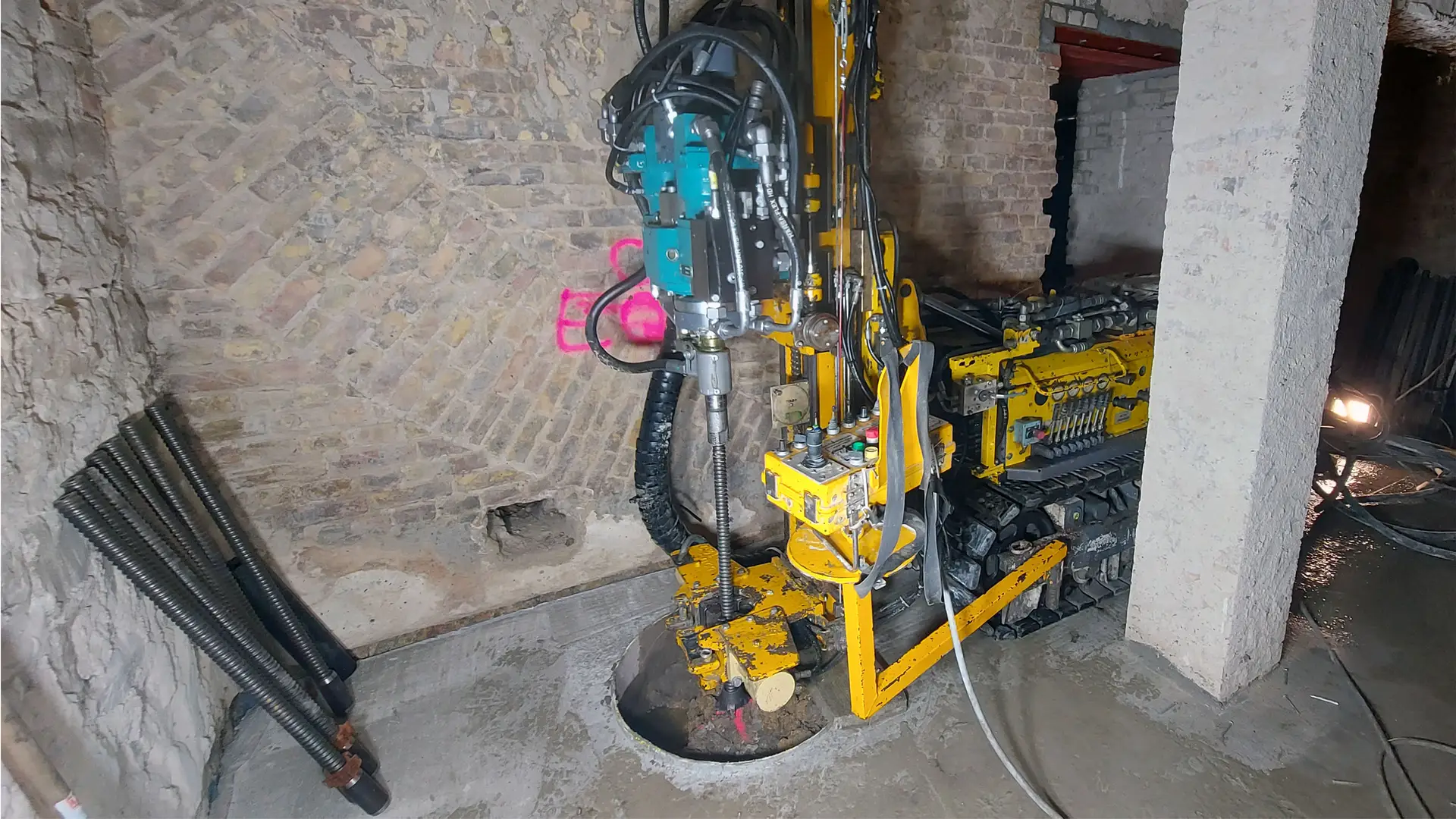 „Die größte Herausforderung bestand in der beengten Arbeitssituation im Keller mit einer maximalen Raumhöhe von nur 2,6 m“, so Silvio Stadach weiter. „Teilweise musste der Einbau mit Handlafetten erfolgen, da nicht alle Räume für das Bohrgerät zugänglich waren.“ Zum Einsatz kamen ein Ankerbohrgerät KLEMM KR 701 mit Lafette, Bohrantrieb, Schlagwerk und elektrischem Powerpack. „Dabei unterstützten uns unsere Kolleginnen und Kollegen der BAUER Spezialtiefbau GmbH, die uns das Gerät zur Verfügung stellten. Es war ideal für die niedrigen Raumhöhen geeignet.“ Die Hauptarbeiten hatten im März begonnen und wurden Anfang Juni 2025 fertiggestellt. Restleistungen wurden im Oktober 2025 erbracht.
