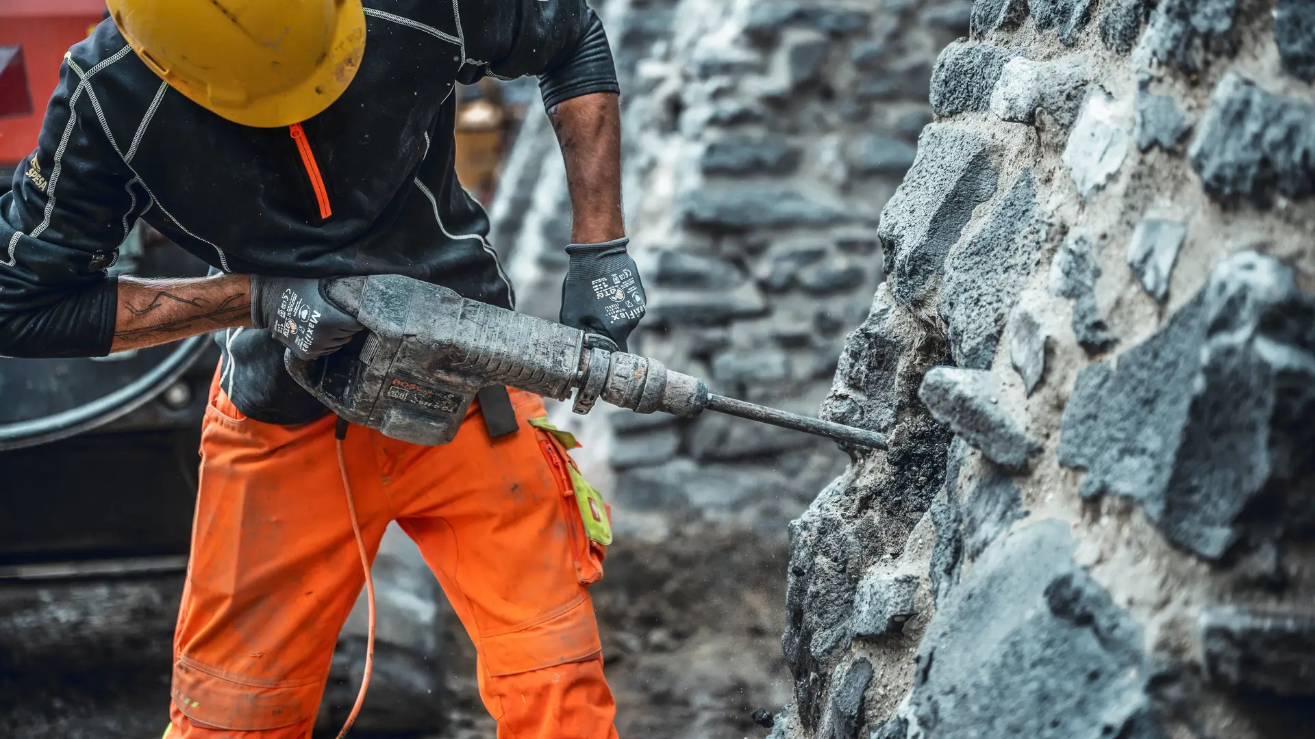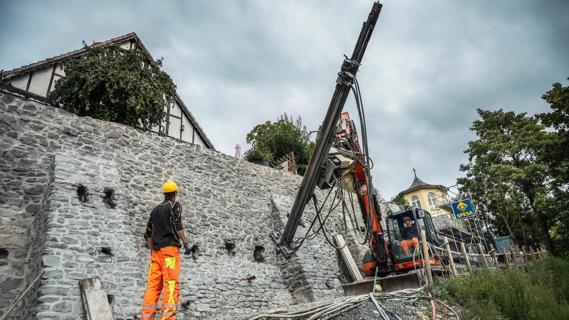 Im Rahmen von Sanierungsplanungen der angrenzenden Straße wurde festgestellt, dass der Bereich des Burgbergs von Homberg Setzungen zeigte. Ein Gutachten verschaffte Gewissheit: Die Gründung der Stadtmauer und die angrenzende Straße wiesen eine Verbindung über die Bodenschichten auf und beeinflussten sich gegenseitig. Ein klarer Fall für unsere Experten von Spesa. Auf einer Länge von ca. 100 m wurde eine umfangreiche Mauerwerksanierung inkl. Ausstemmen der Fugen, Reinigung und Neuverfugung ausgeführt. Zur Stabilisierung der Stadtmauer erfolgten 500 m Injektionsbohrungen sowie der Verbau von 250 m Mauerwerksnadeln. Zusätzlich wurden eine Mauerwerkverpressung sowie Kleinbohrpfähle als Gründungen hergestellt.