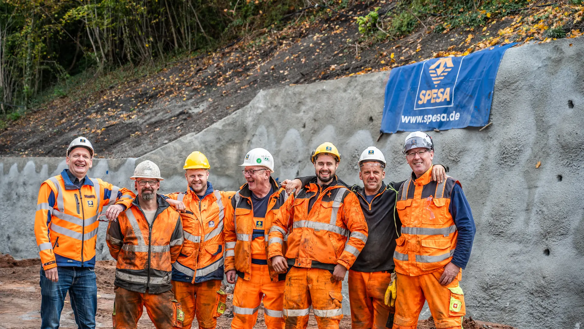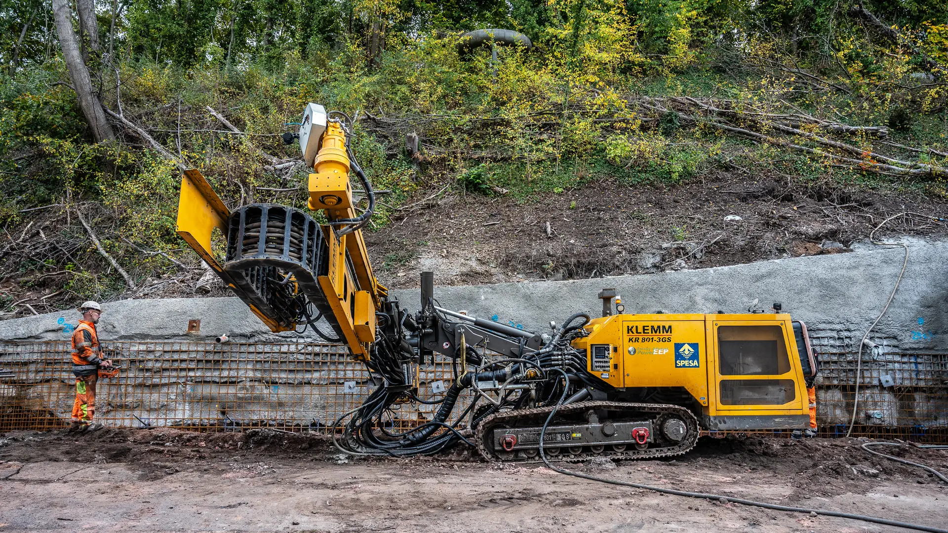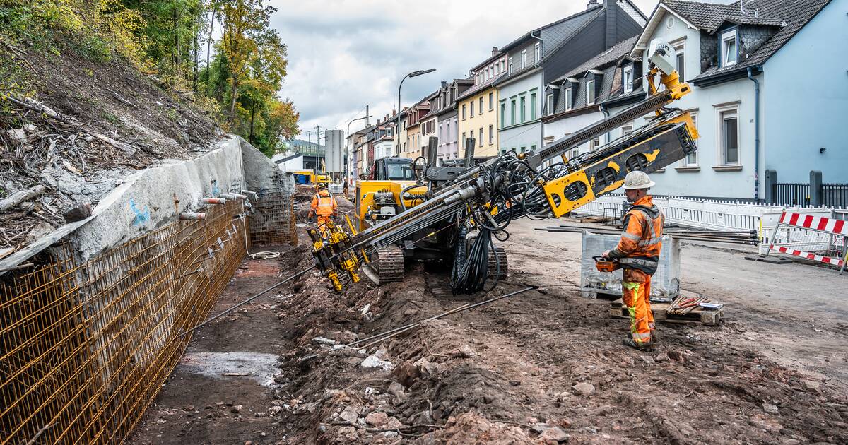 Zunehmender Autoverkehr, immer mehr Radfahrer und Fußgänger – und das bei beengten Platzverhältnissen zwischen Bahndamm und Häuserfront: Die Trippstadter Straße in Kaiserslautern ist ein Nadelöhr. Nun wird das Verkehrskonzept überarbeitet. Die Herausforderung: Der benötige Raum muss zunächst geschaffen werden. Das Tiefbau-Referat der Stadtverwaltung Kaiserslautern setzte dabei auf die Kompetenz der Spesa. Mithilfe von Spezialbaggern wurden zunächst große Teile des angrenzenden alten Bahndamms abgetragen und zurückgebaut. Um den verbleibenden Hang dauerhaft zu stabilisieren, wurden insgesamt 300 Verpressanker mit einer Länge von 7 bis 8 m in die Wand eingebracht. Im Anschluss wurden die Anker mit einer Zementsuspension verfüllt und mit Bewehrungsmatten zusätzlich verstärkt. Den Abschluss bildete eine 20 cm dicke Schicht aus Spritzbeton, die den Hang stabilisiert und schützt. Der eigentliche Straßenausbau ist für das Frühjahr 2026 vorgesehen.