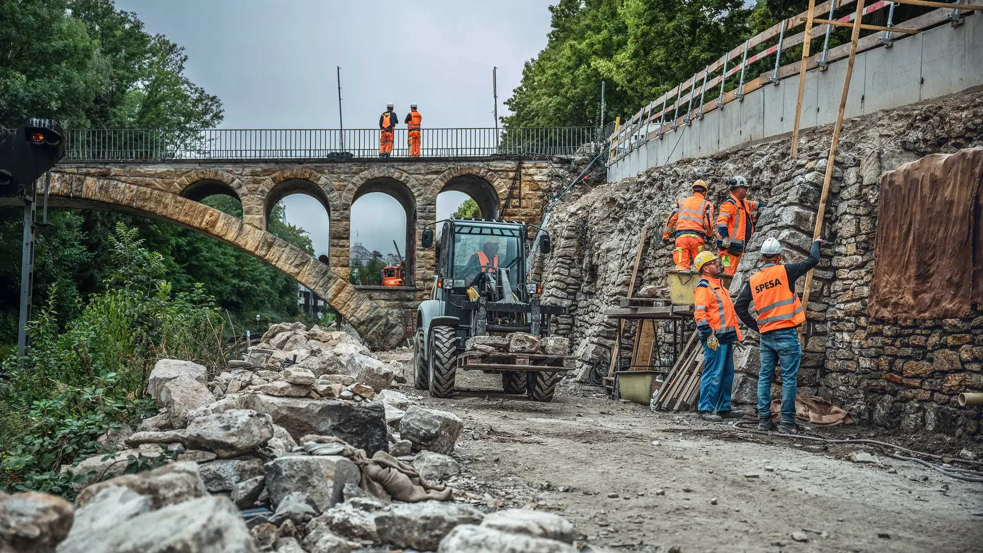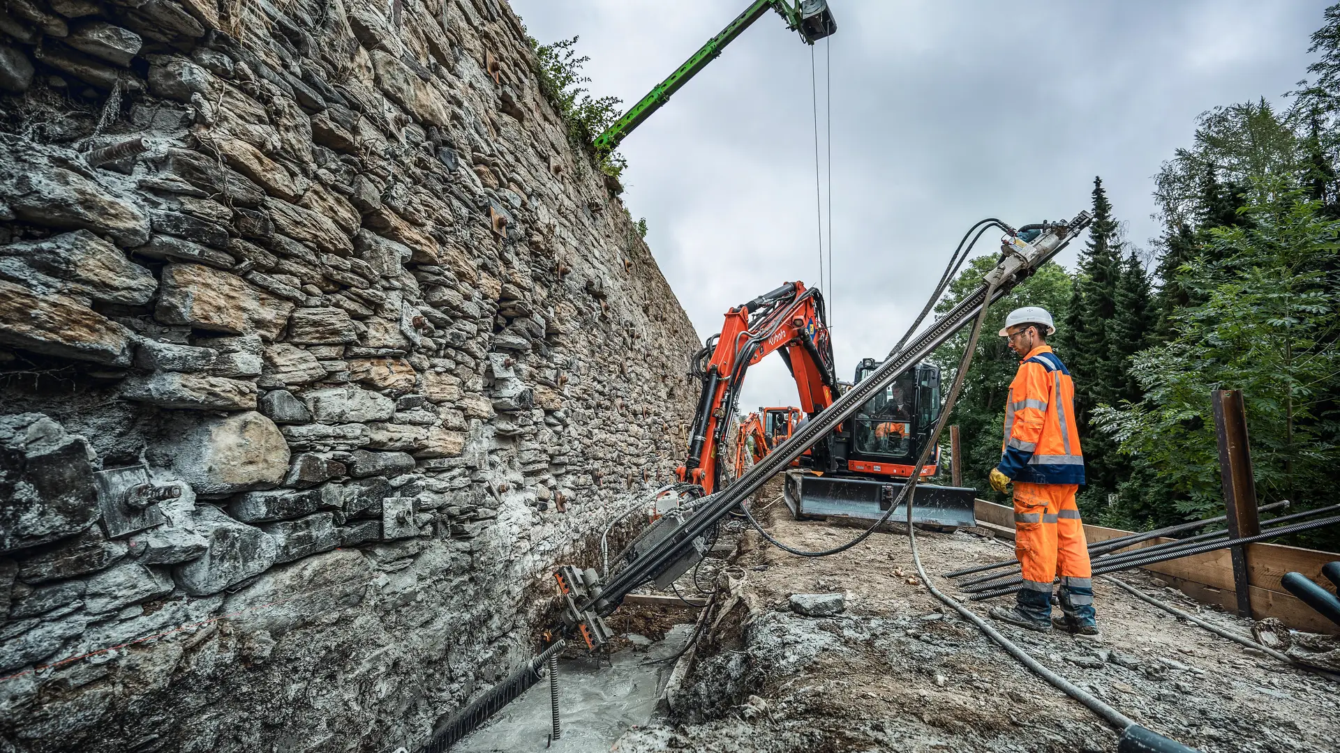 Die Sanierung der 450 m langen Feldsteinmauer am Georgenberg in Goslar barg einige Herausforderungen. Aufgrund des desolaten Zustands der Mauer wurde während der Arbeiten teilweise erst vor Ort über die weitere Vorgehensweise entschieden. Voraussetzung dafür? Jede Menge Flexibilität. Und damit kennen sich unsere Experten von der Spesa bestens aus. So erfolgte im ersten Sanierungsabschnitt die temporär statische Sicherung der Feldsteinmauer sowie die Fertigung des rückverankerten Stahlbeton-Kopfbalkens mithilfe von Mikropfählen. Anschließend konnten sowohl die erforderliche Instandsetzung des Mauerwerks als auch die damit verbundenen Verbauarbeiten beginnen. Trotz aller Herausforderungen und Hürden konnten die gesamten Baumaßnahmen Stein auf Stein Ende 2023 erfolgreich abgeschlossen werden.