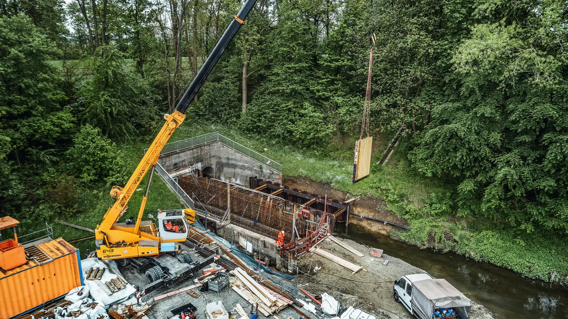 Ein Bruchgrabendurchlass aus den 1920er Jahren? Kein Problem für unsere Spezialisten für Bauwerksanierung. Die Spesa Spezialbau und Sanierung erhielt den Auftrag, den Bruchgrabendurchlass bei Algermissen, Nähe Hildesheim, ein- und auslaufseitig in Ortbetonbauweise zu verlängern sowie die Bestandsrohre zu sanieren. Die Instandsetzungsarbeiten und der Neubau erfolgten abschnittsweise, wobei der Abfluss des Wassers zu jeder Zeit gewährleistet sein musste. Insgesamt wurden 258 t Stahlspundbohlen zur Baugrubensicherung sowie für Gründungsarbeiten und Wasserhaltung verbaut. Für die Verlängerung des Bauwerks im Ein- und Auslaufbereich wurden 1.100 m³ Stahlbeton hergestellt und dabei 108 t Bewehrungsstahl verwendet, die Betoninstandsetzung umfasste 1.875 m². Abschließend wurden die Sohl- und Böschungsbefestigungen auf einer Fläche von 247 m² neu angelegt und profiliert. Das Bauwerk erhielt zudem neue Schutzeinrichtungen und ist nun überfahrbar. Ein Bauwerk fit für die Zukunft.